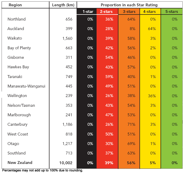 This table shows the Star Rating results for each of the 15 regions. The results illustrate what percentage of the rural state highway network fall within each of the 5-Star Rating bands.
