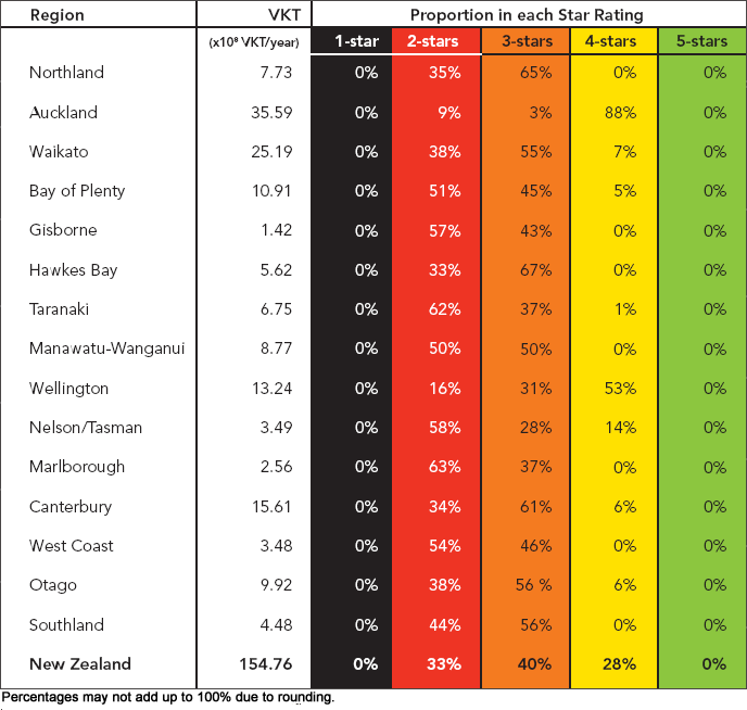 This table shows the Star Ratings for each of the 15 regions based on vehicle kilometres travelled.