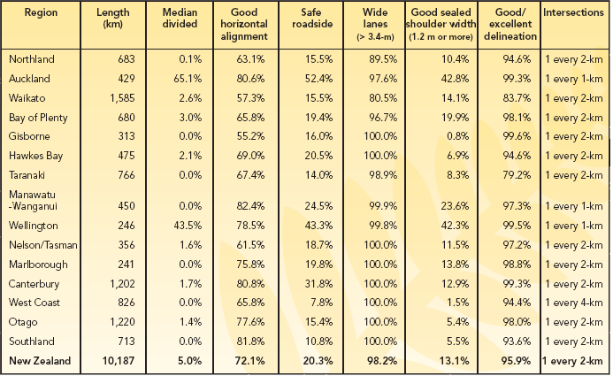 This tables provides a snapshot of the key safety features that have a large influence on safety outcomes over New Zealand's rural state highways.