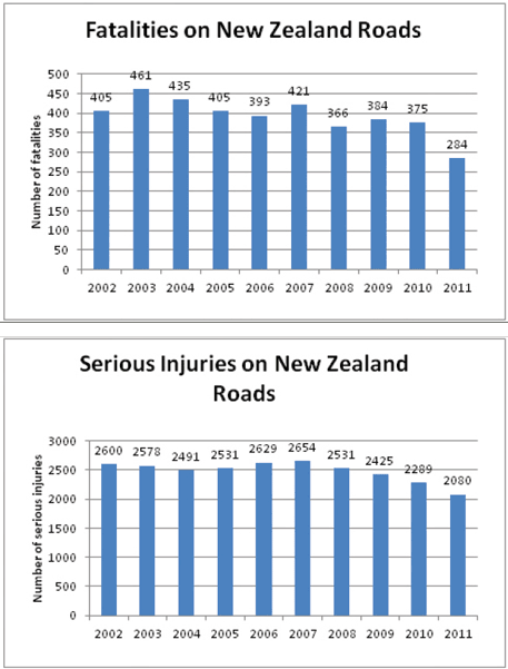 In 2011, 284 people died on New Zealand roads and around 2,080 were seriously injured. While there is no room for complacency, this is a significant improvement on previous years.